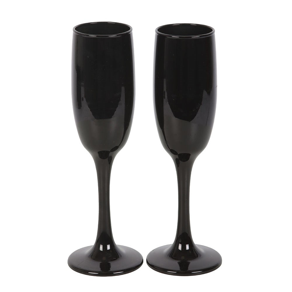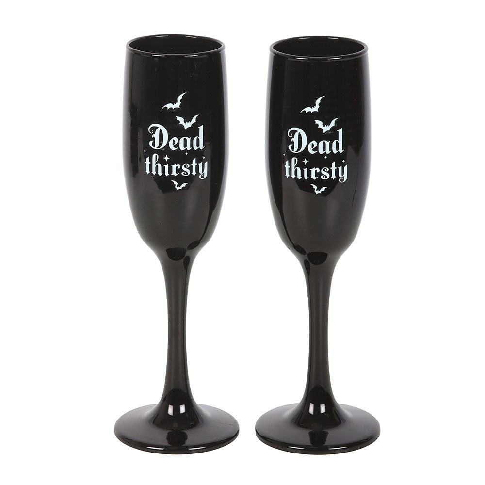 Celebrate with a gothic twist using this set of 2 'Dead Thirsty' champagne flutes. Featuring a sleek black design, they're perfect for spooky celebrations, weddings, or special occasions with a touch of flair.