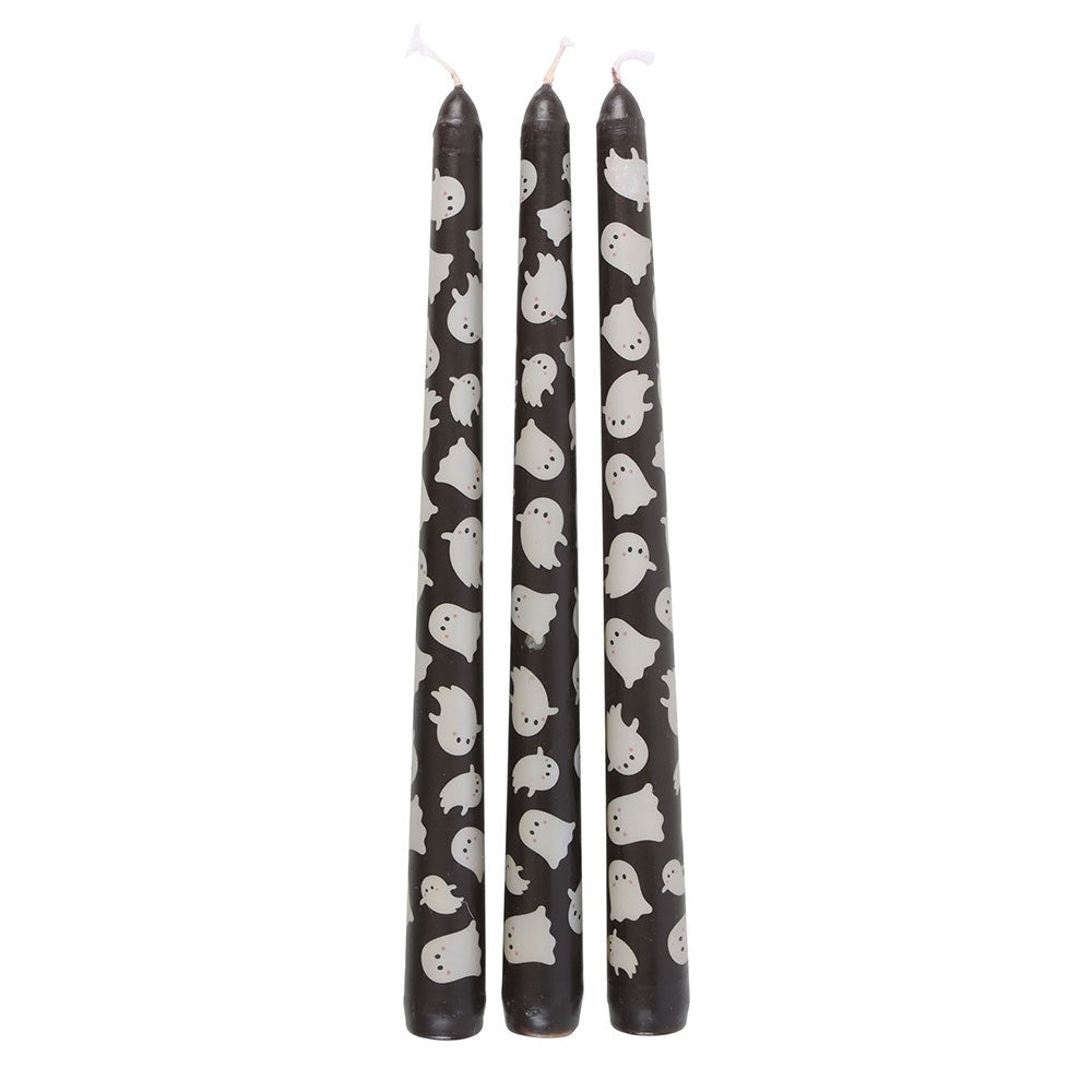 This set of three unscented taper candles, featuring a playful ghost print, adds a fun and festive touch to Halloween table settings and decor. A great way to illuminate the spooky season.