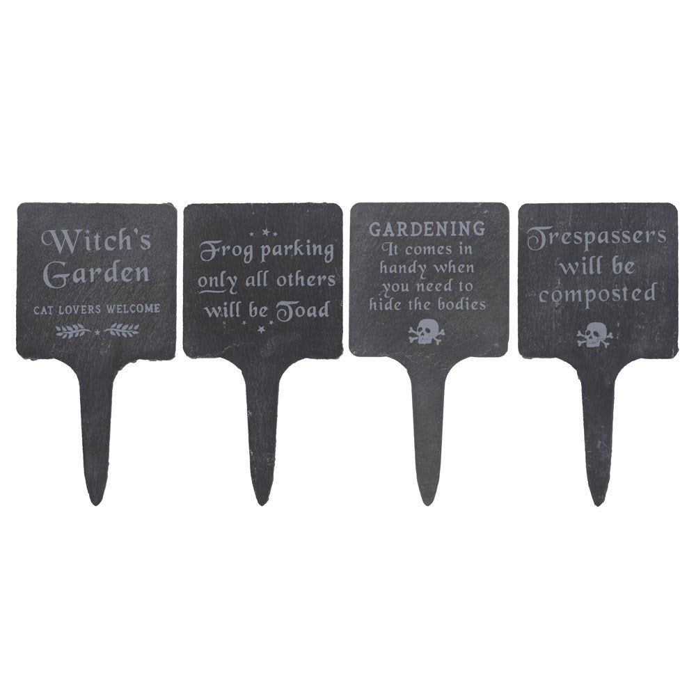 This set of 4 slate garden signs will add a touch of humour and style to your outdoor space. Each sign is made of slate and features a unique Gothic-style humorous phrase that will create a playful atmosphere. Perfect for those looking to add a hint of playful charm to their garden for Halloween.