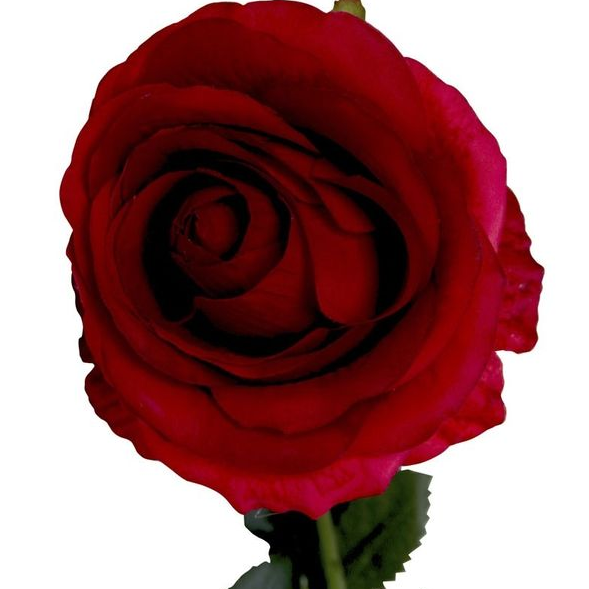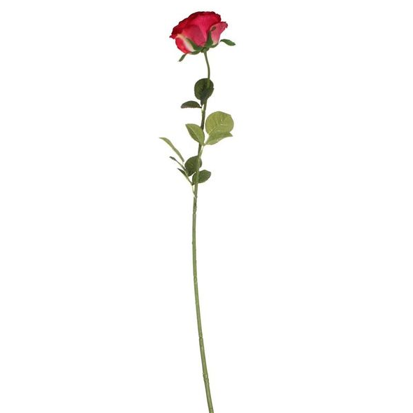 A single stem flower, featuring an open rose in scarlet red, foliage on the stem.