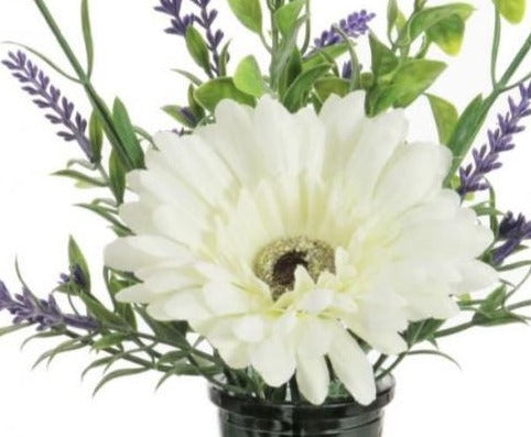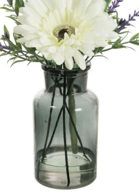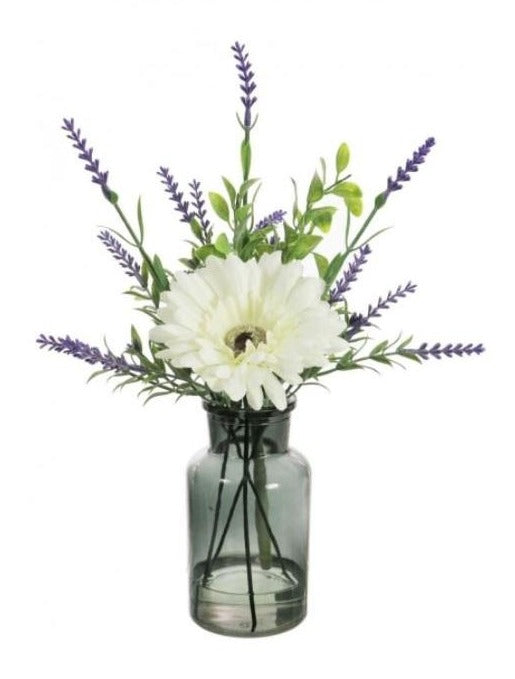 This single Gerbera in a vase adds an elegant, realistic touch to any home. The vibrant Gerbera is carefully arranged with lavender and leaves, in a tinted glass vase. The colour is cream, creating a soft yet luxurious look. Perfect to decorate any room.