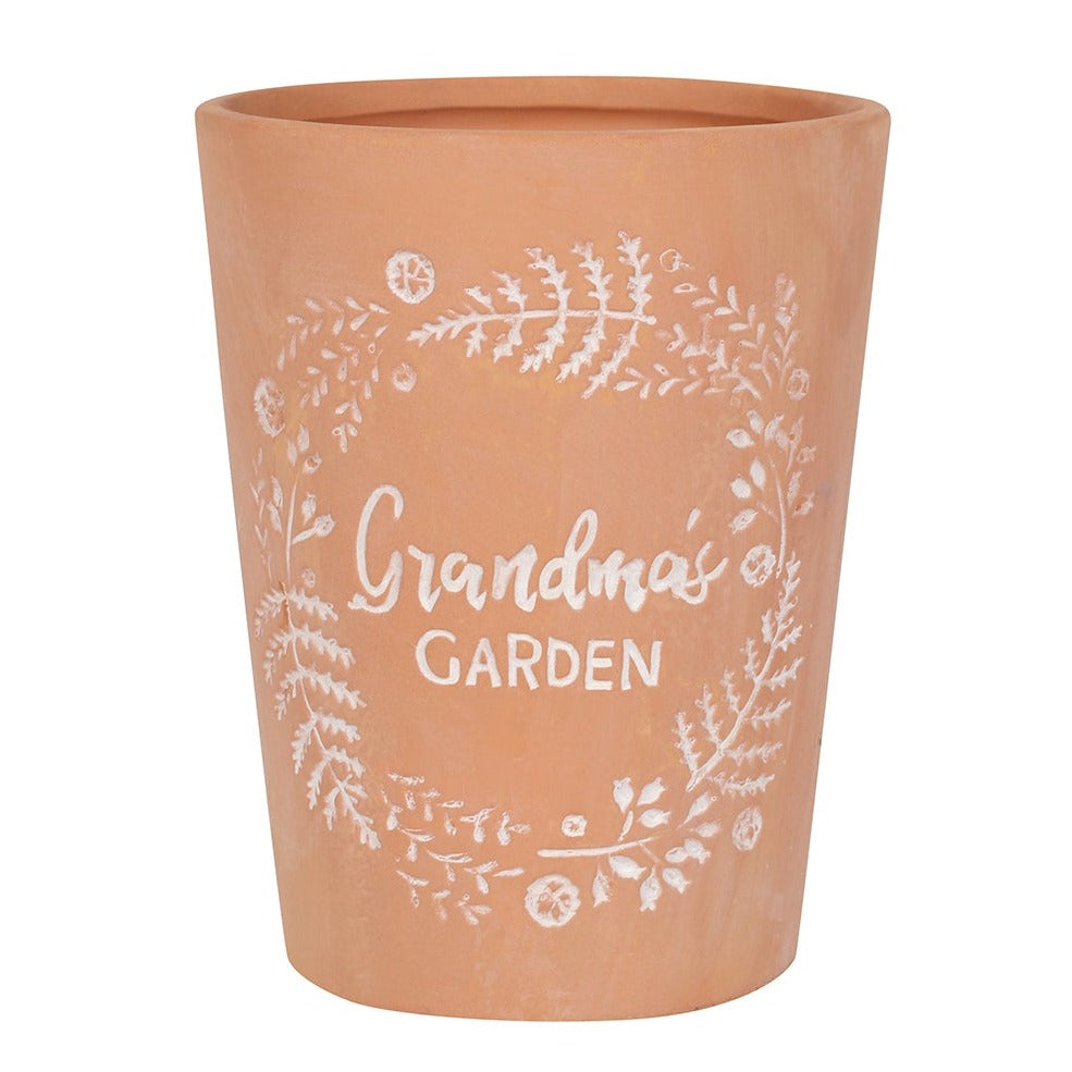 Beautiful and stylish terracotta plant pot featuring the words 'Grandma's Garden'. This item would be a lovely gift for a grandmother on her birthday or any other special occasion.