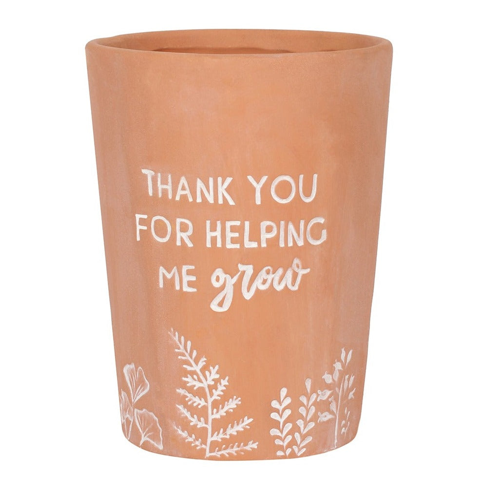 Beautiful and stylish terracotta plant pot featuring the words 'Thank you for helping me grow'. This item would be a lovely gift for a parent or teacher.
