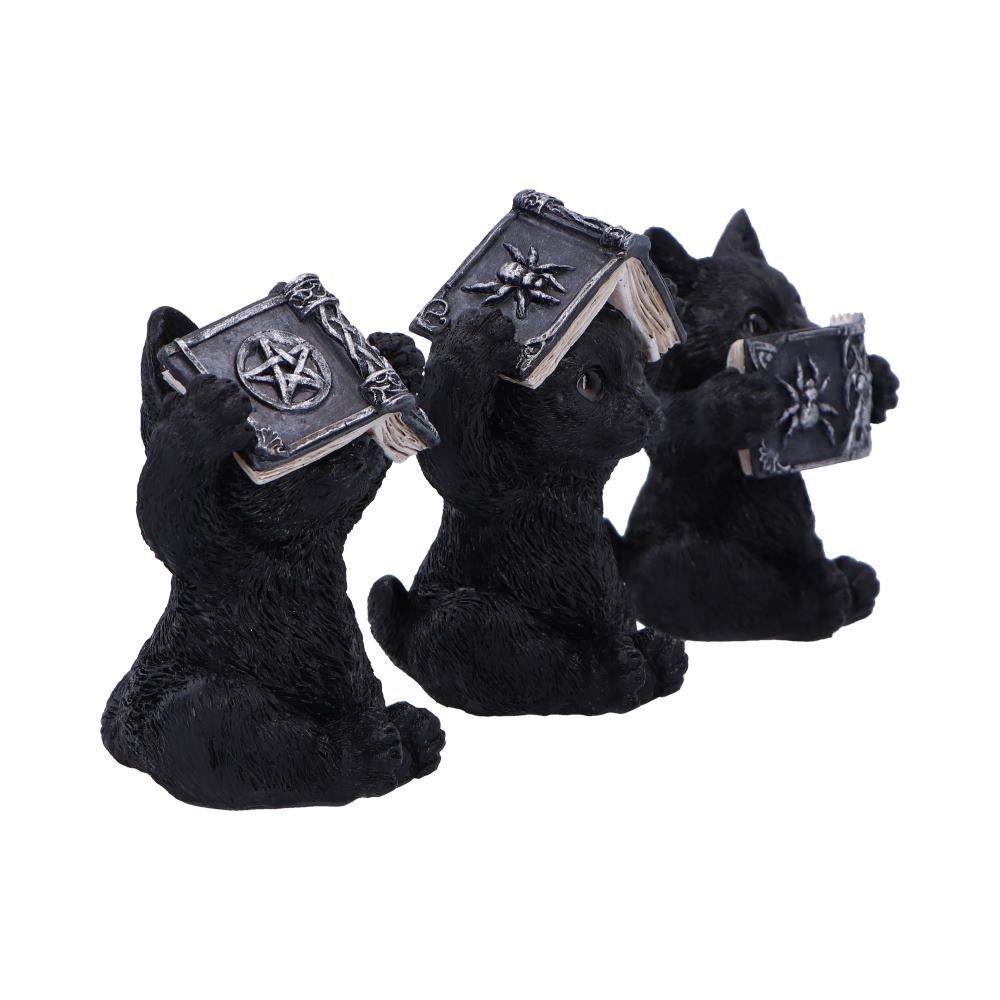 Embark on a journey into the mystical world of feline enchantment with the Three Wise Spell Cats, a delightful creation from Nemesis Now's value collection. Crafted with meticulous attention to detail, these three adorable kittens are more than just charming companions they are keepers of arcane wisdom, whimsically re-enacting the famous 'See No Evil, Hear No Evil, Speak No Evil' maxim. Each kitten is seated cross-legged, immersed in the secrets of the occult, holding a book that imparts mystical knowledge from their familiar masters. One kitten playfully covers its eyes with the opened book, another covers its ears, and the third covers its mouth, symbolizing the wisdom they possess. Meticulously crafted from resin and intricately hand-painted, this set captures the essence of magical feline companions.