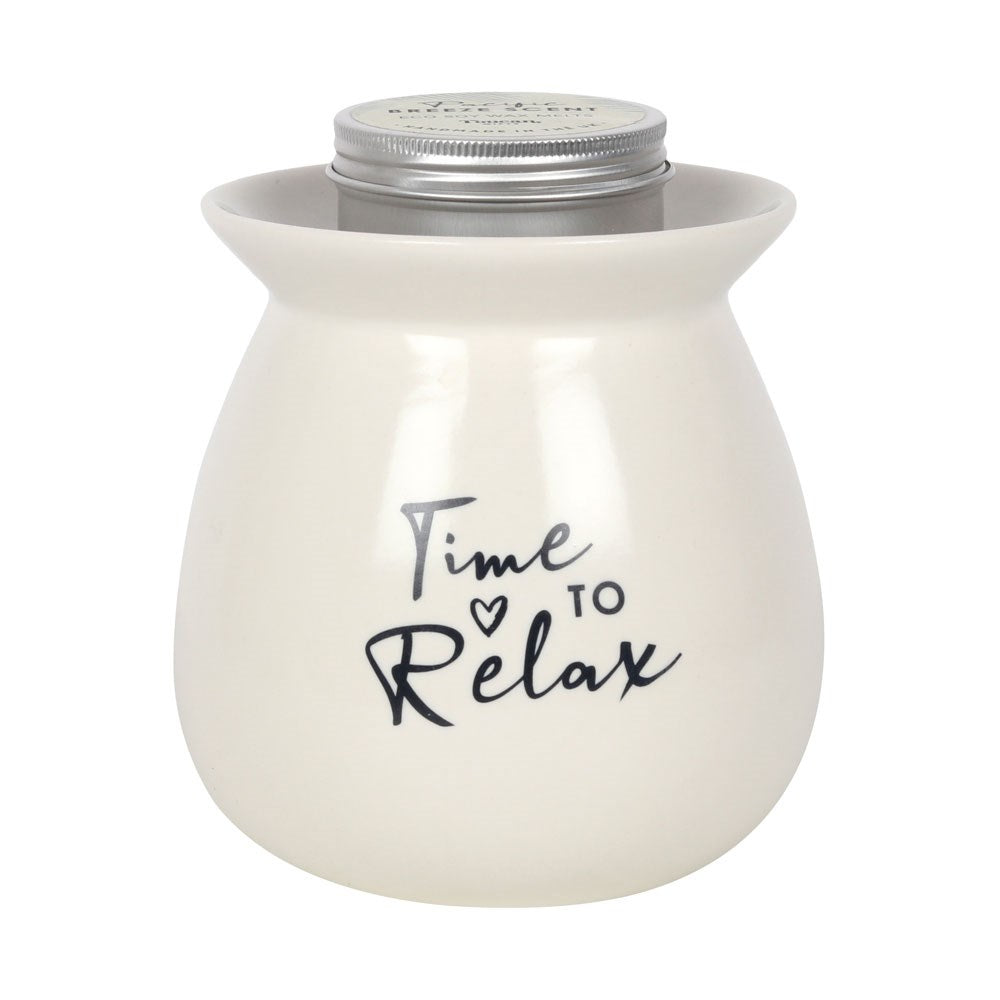This wax melt burner gift set includes a grey-accented ceramic burner with 'Time To Relax' text. Includes a tin of Pacific Breeze eco soy wax melts in a lovely gift box and makes a perfect gift for Mother's Day and birthdays.