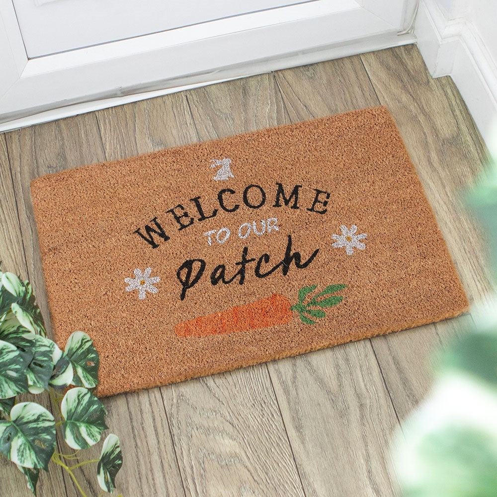 Welcome guests of all varieties with this charming coir doormat. Features 'Welcome to our patch' text and adorable illustrations of a rabbit, carrot and daisies. The perfect doormat to display indoors or under sheltered porches during springtime and Easter. Please note that the printed design may fade when left outside in extreme weather.