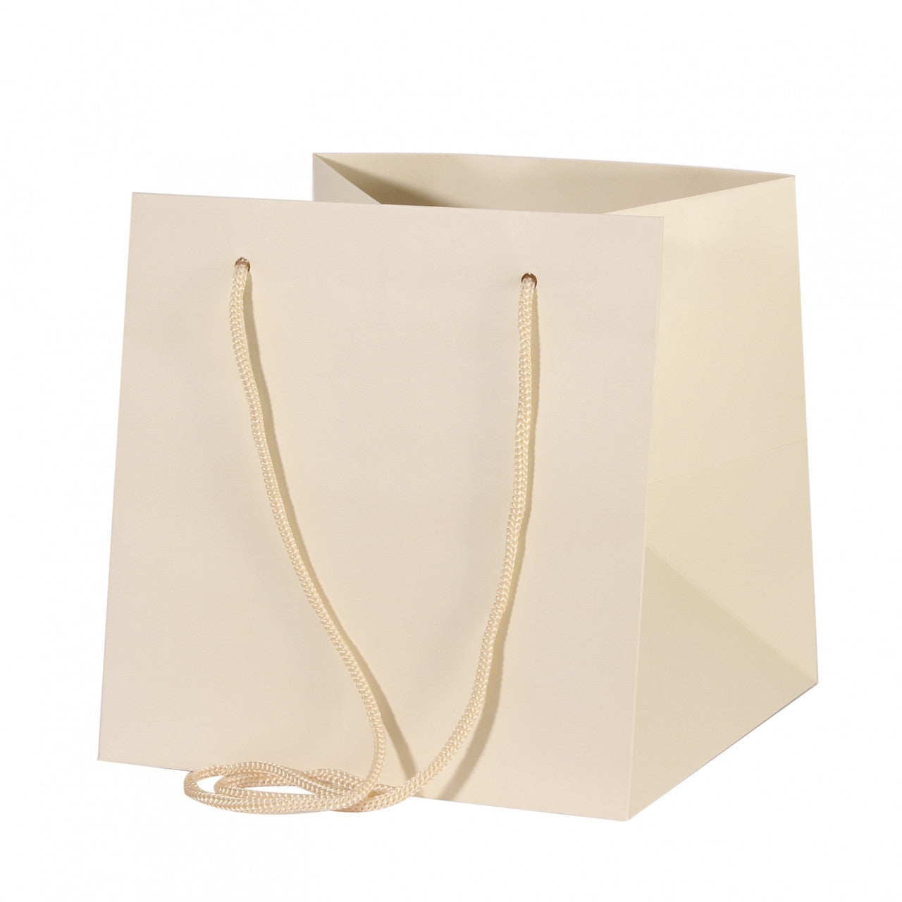 A cream hand tie bag with rope handles. Beautiful hand tied bags make the perfect gift holder for any occasion. Easy, efficient and reusable.